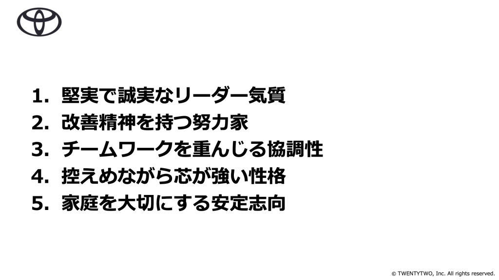 筋肉質すぎず細すぎない、健康的な体型です。これは、トヨタが求める「チームワーク」「調和」を大切にする姿勢を表しています。