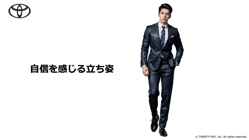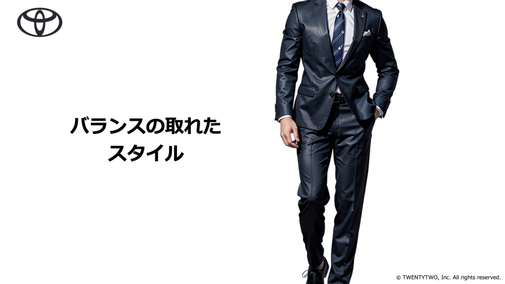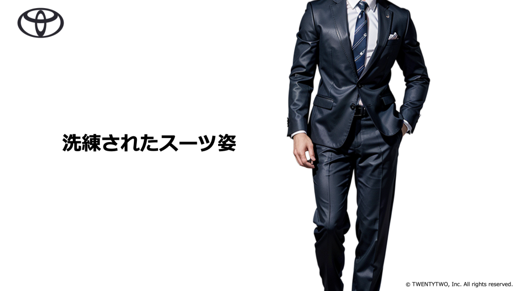 スーツのシルエットがきっちりと整っており、無駄のない仕立てです。ものづくり企業らしい「精度」と「信頼性」を重視するトヨタらしさが表れています。