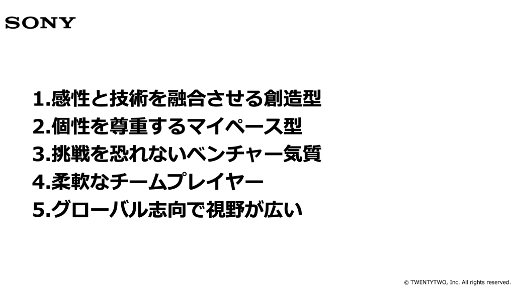 ソニーは海外拠点が多く、社員の多くが国際的な感覚を持っています。英語での会議や海外出張にも前向きで、異文化理解に積極的です。最新の世界トレンドをキャッチしながら、自分の仕事に反映させる柔軟性と好奇心が強いのが特徴です。