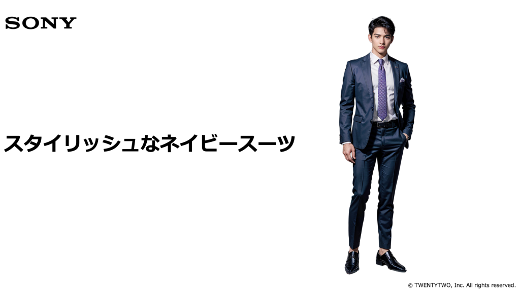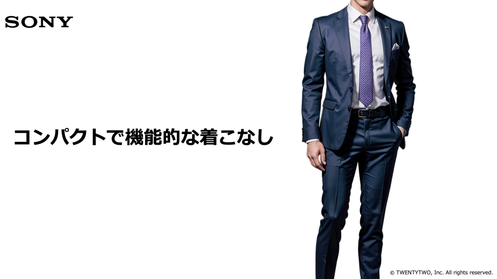 洗練されたシルエットのスーツは、エンタメからテクノロジーまで幅広い領域で“デザイン性と機能美”を重視するソニーらしさを映しています。