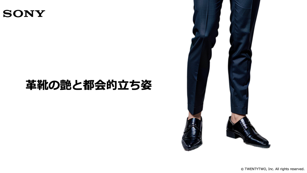 磨き込まれた革靴と、まっすぐ立つ姿勢が都会的でグローバル企業らしい印象です。世界基準を意識する企業DNAがにじみ出ています。