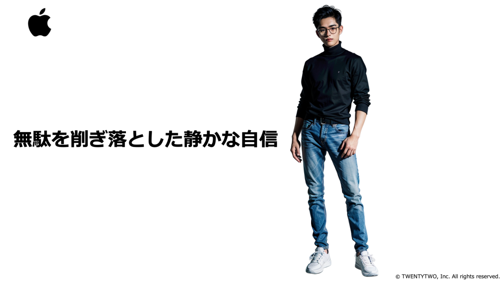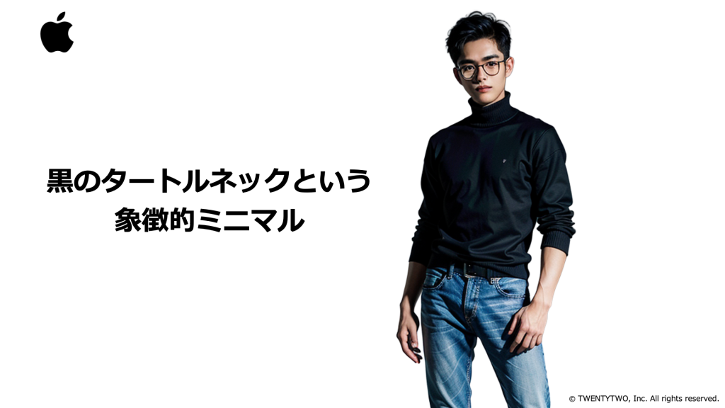 黒のタートルネックは、スティーブ・ジョブズを連想させる象徴的なスタイルです。装飾を排し「余白と本質」を大切にするAppleのデザイン哲学が表れています。
