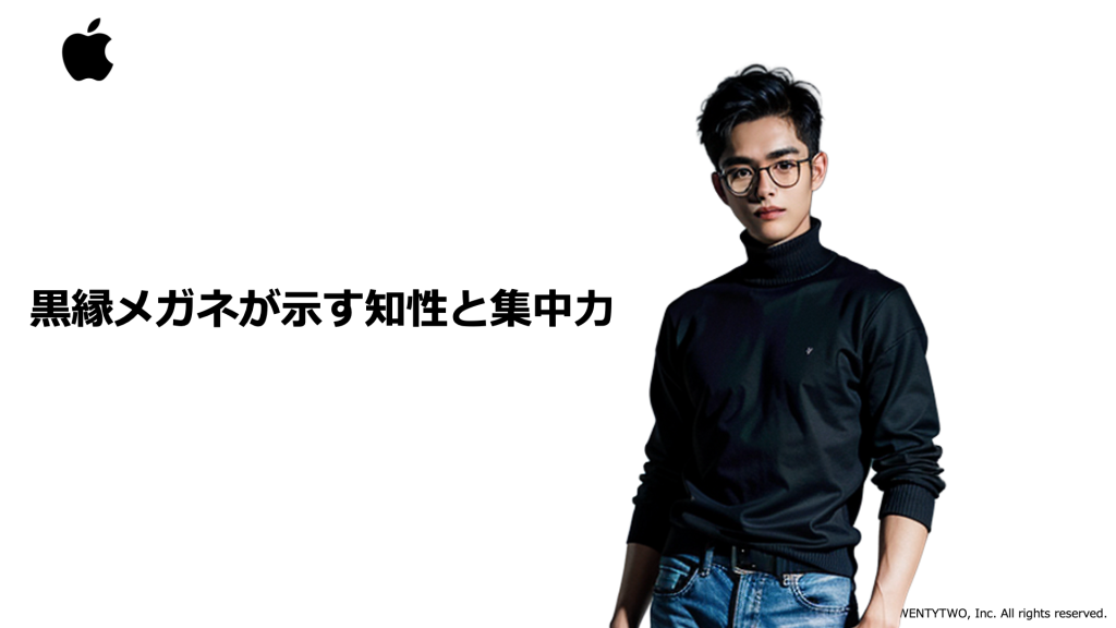 モダンな黒縁メガネは、理性的・分析的な思考と、細部まで集中する姿勢を感じさせます。デザインとテクノロジーの融合を担う人材像とマッチします。