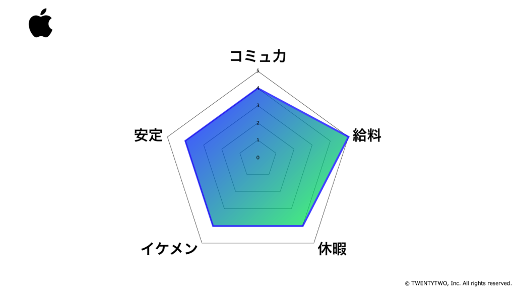 Appleは世界的ブランド力と圧倒的な利益体質を持ち、日本市場でも高い売上を維持しています。ただし、外資系特有の成果主義や人員再編の可能性はあり、終身雇用的な安定は保証されません。高い業績基盤はあるものの、そのため評価は4です。