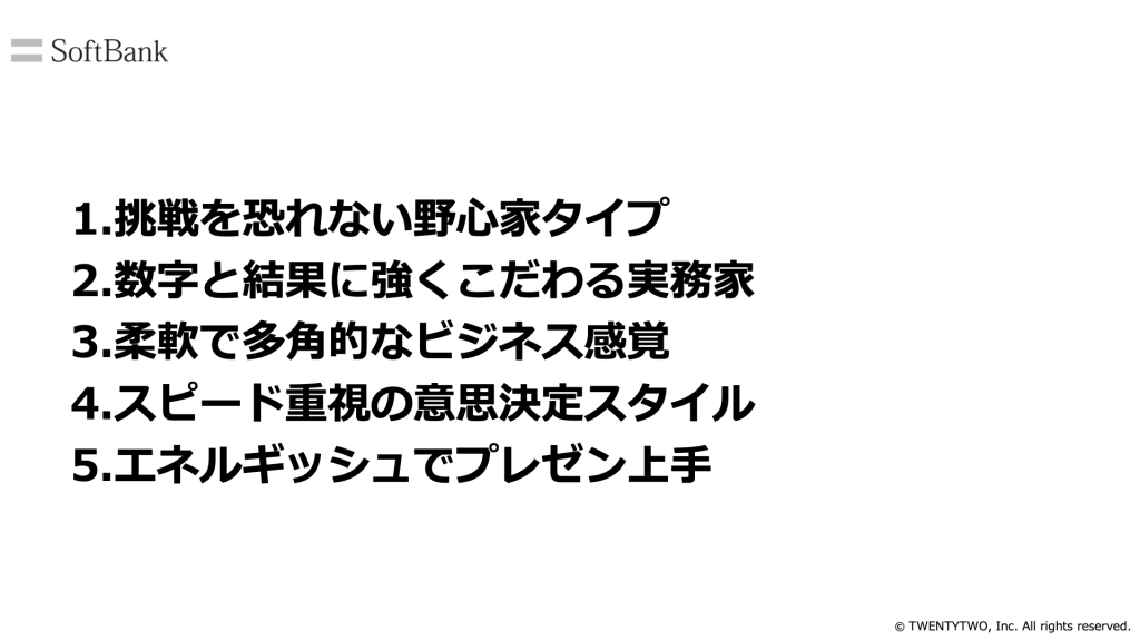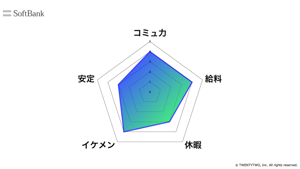 ソフトバンクはスピード感のある意思決定と挑戦を重視する環境のため、自ら提案し、積極的に周囲を巻き込む力が求められます。社内外の交渉や企画も多く、論理性と愛嬌のあるコミュニケーションが強みです。一方で、全員が柔らかい話し方をするわけではないため4としました。