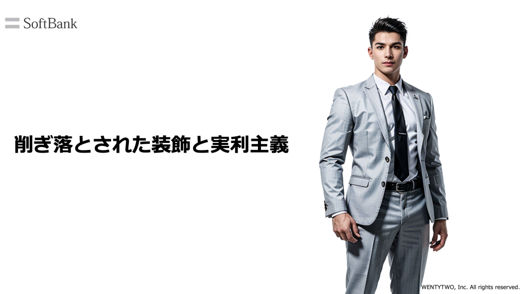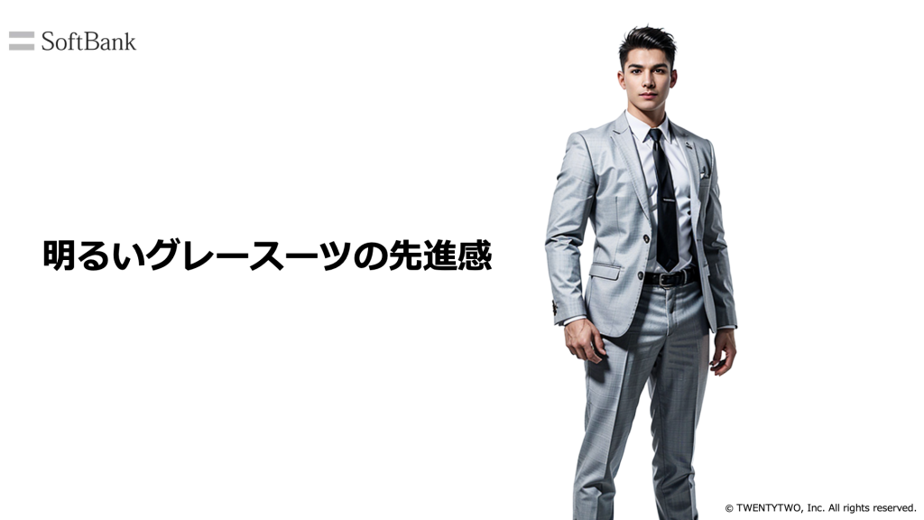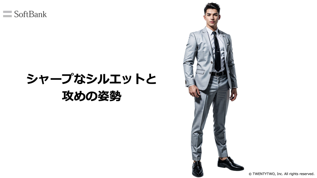 淡いグレーのスーツは、通信・IT・AIなど新しい領域へ常に挑戦するソフトバンクの「革新性」や「スピード感」を象徴しています。堅実さよりも未来志向な雰囲気です。