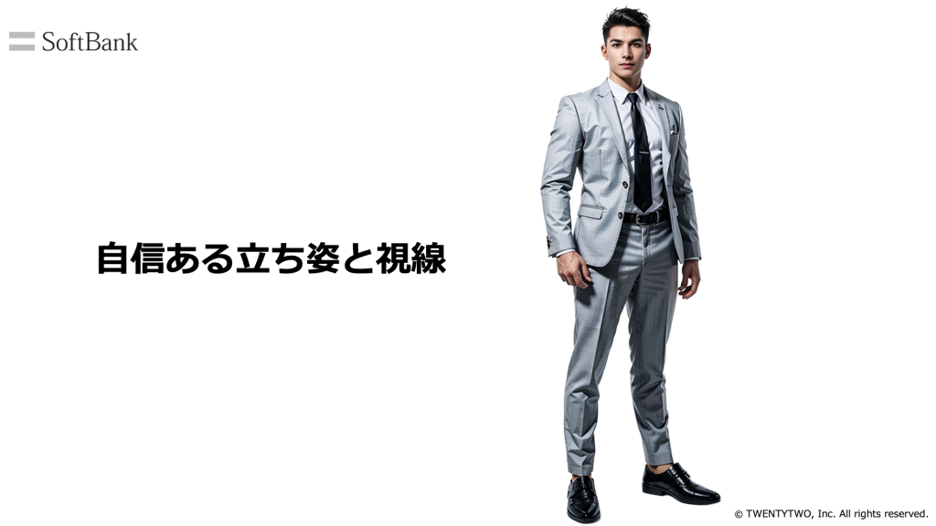 真正面から視線を向ける立ち姿には、「やると決めたら徹底的にやる」「迷わず決断する」といった孫正義イズムに通じる強い意志と胆力が表れています。