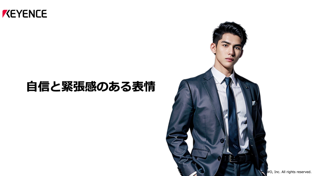 体にフィットしたシャープなスーツは、効率性・成果主義を重んじるキーエンスの文化を象徴しています。装飾よりも実用性と機動力を優先した印象です。