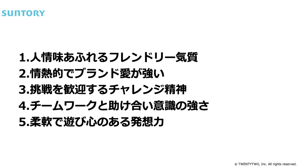 「やってみなはれ」の精神を受け継ぎ、自分の仕事や商品に誇りを持っています。ウイスキー・ビール・飲料など、それぞれのブランドに対する思い入れが強く、自社の商品を心から愛しています。情熱を持って企画・営業に取り組む姿勢が特徴です。
