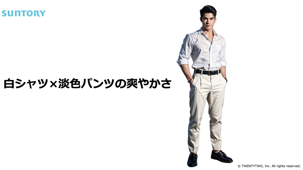 清潔感のある白シャツとベージュ系パンツの組み合わせは、「水と生きる」という企業スローガンにも通じる爽やかさと自然体の雰囲気を表しています。