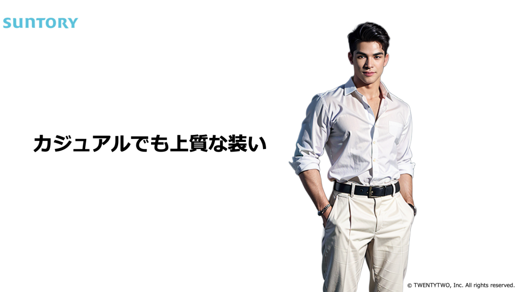 全体はカジュアルですが、革靴・ベルト・シルエットに上品さがあり、「遊び心と品格の両立」というサントリーのブランド精神にも通じます。