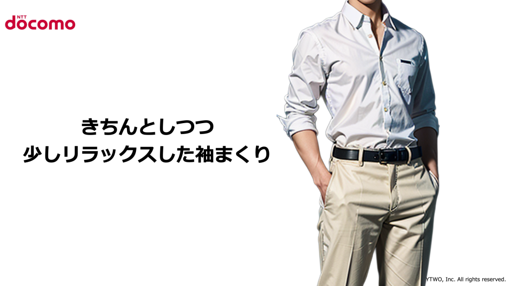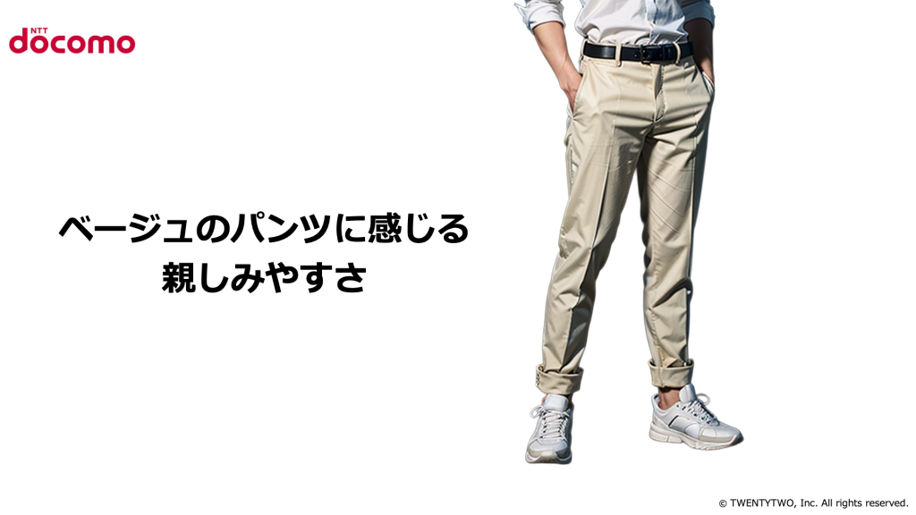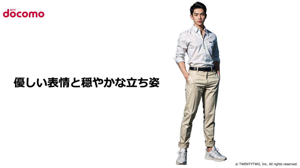 スーツではなく、柔らかい色味のパンツを合わせたスタイルは、「お客さま第一」「身近なサービス」としてのドコモのブランドイメージに通じます。堅すぎず、ほどよく親しみやすい雰囲気です。