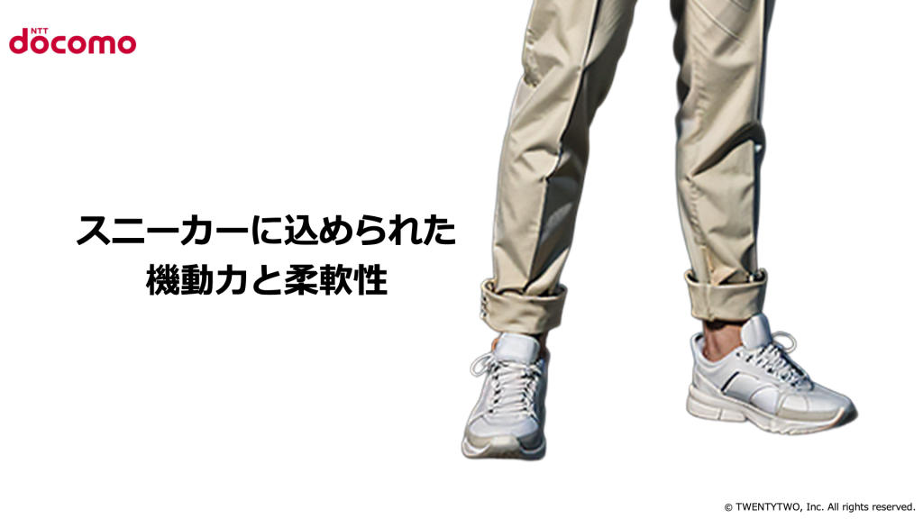 白いスニーカーは、形に縛られない考え方とスピード感を象徴しています。通信業界の変化に対応し続ける柔軟な企業姿勢がにじんでいます。