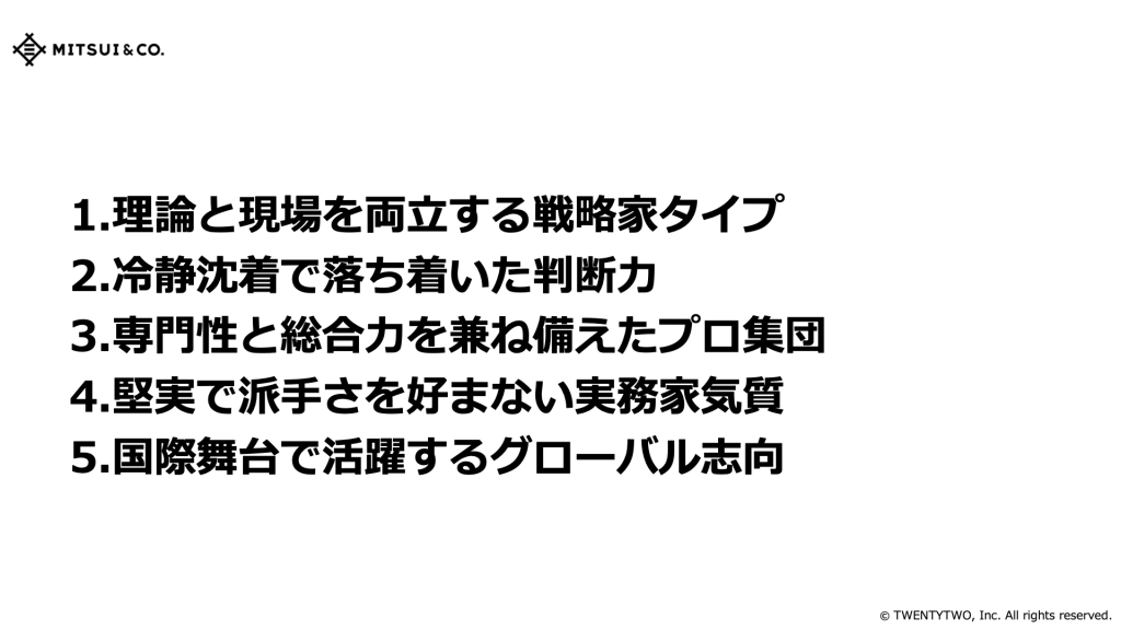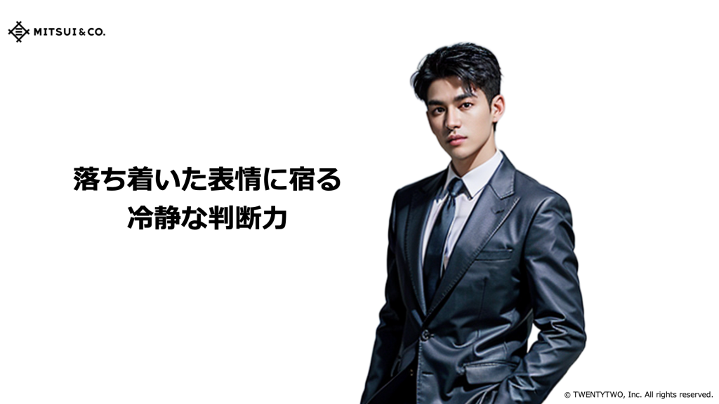 強すぎる主張ではなく、冷静で柔軟な視線が印象的です。リスク管理・多角的視点・交渉力を重んじる三井物産らしい“静かな胆力”が感じられます。