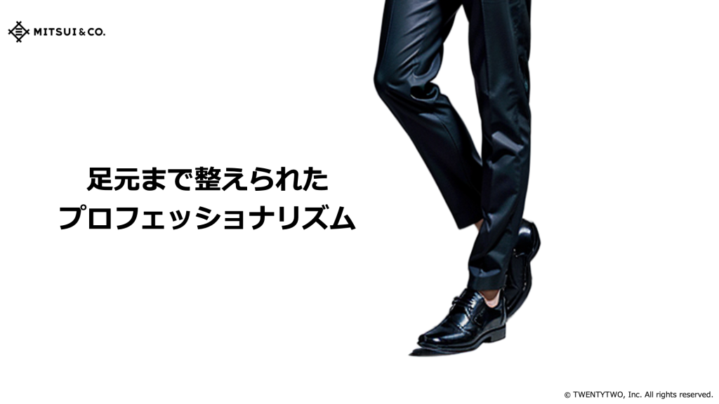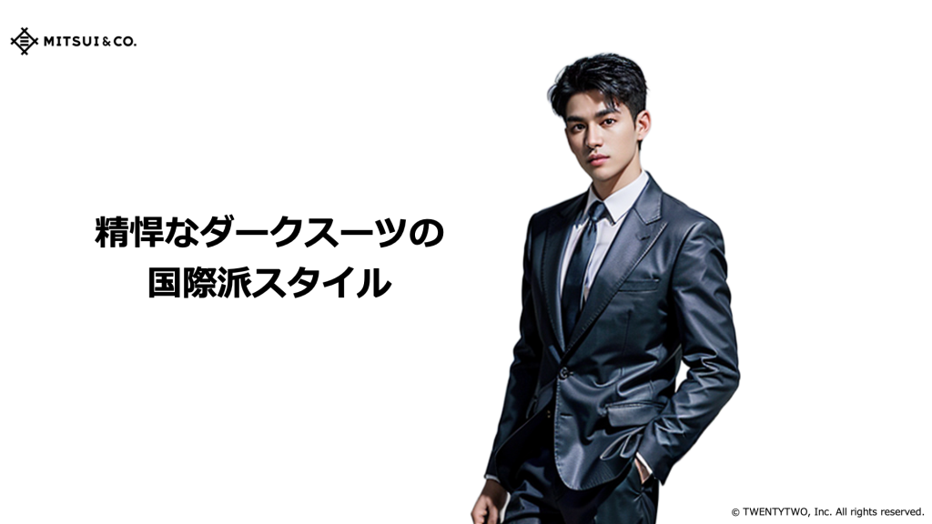 深いネイビーやチャコールのスーツは、三井物産が世界中で事業を展開する“グローバル総合商社”であることを象徴しています。知的で洗練された雰囲気が漂います。