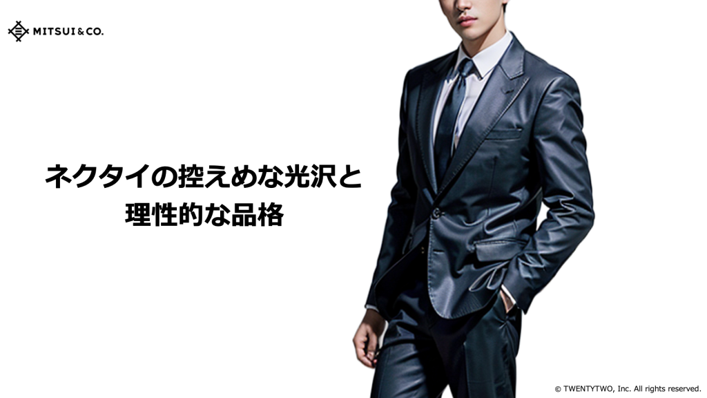 派手ではなく上品な光沢のあるネクタイは、感情よりも論理・信頼関係を軸にビジネスを進める姿勢を映しています。欧米・アジアどちらとも交渉できるバランス感覚です。