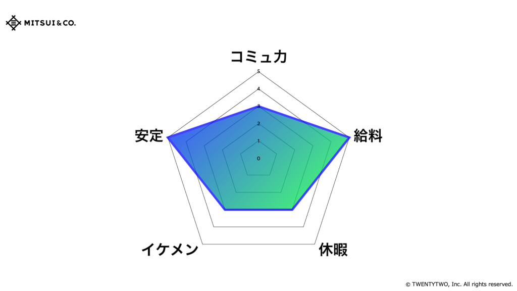 「コミュ力」「給料」「休暇」「イケメン」「安定」の 5つの項目を、それぞれ 5点満点で採点しました。