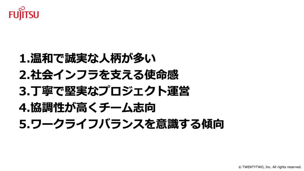 富士通の社員は、落ち着いた雰囲気で丁寧なコミュニケーションを取る人が多く、顧客対応やプロジェクト管理では誠実さが重視されます。派手さや積極的なアピールよりも、協調性や堅実さが中心であるため、平均的な評価の3としています。