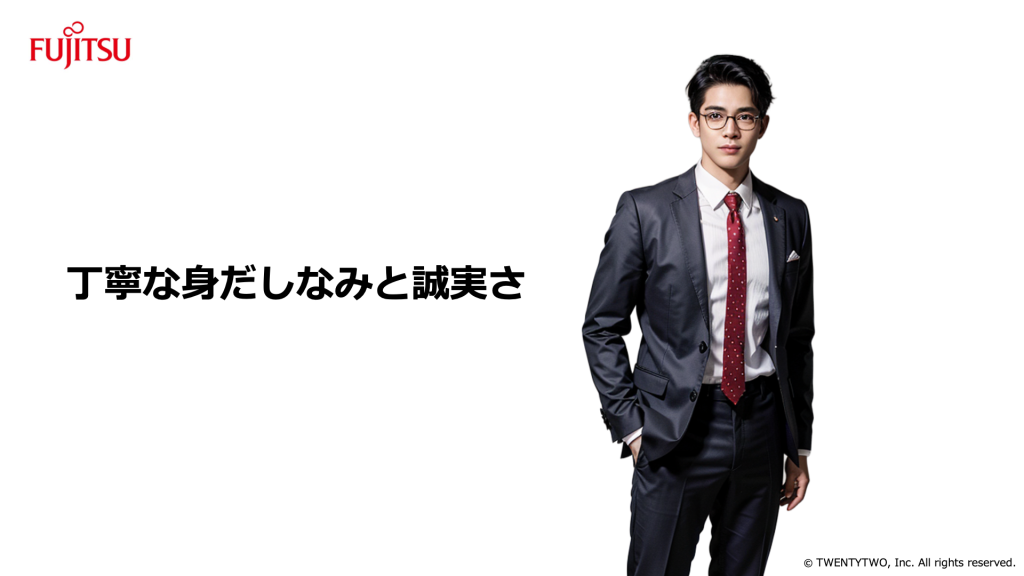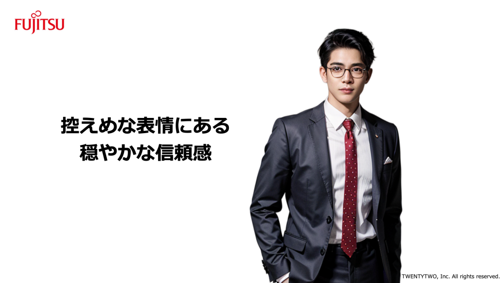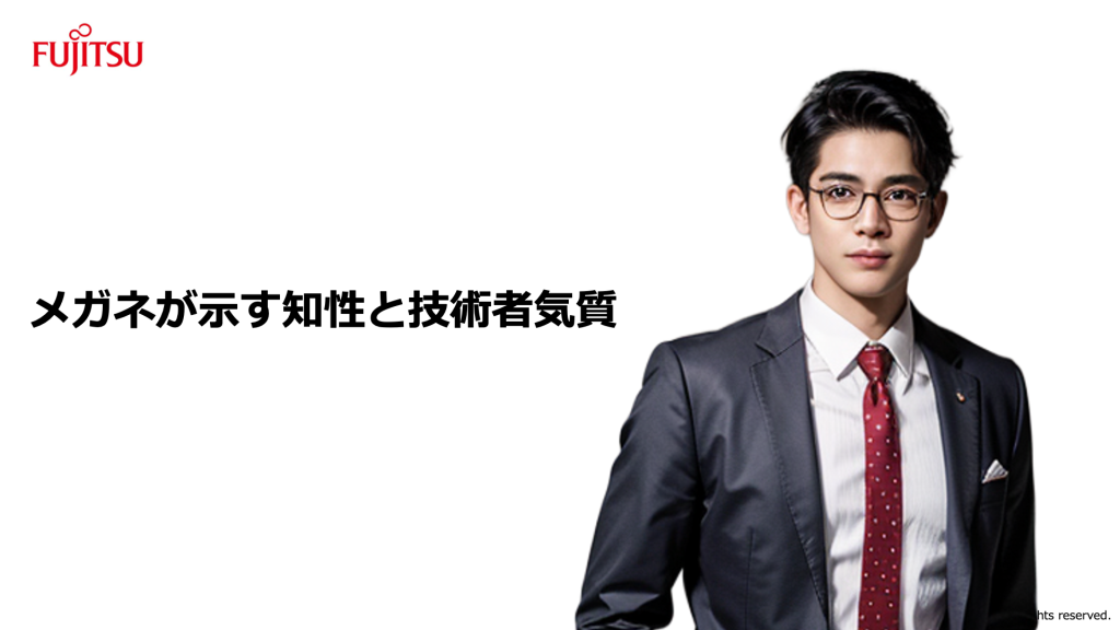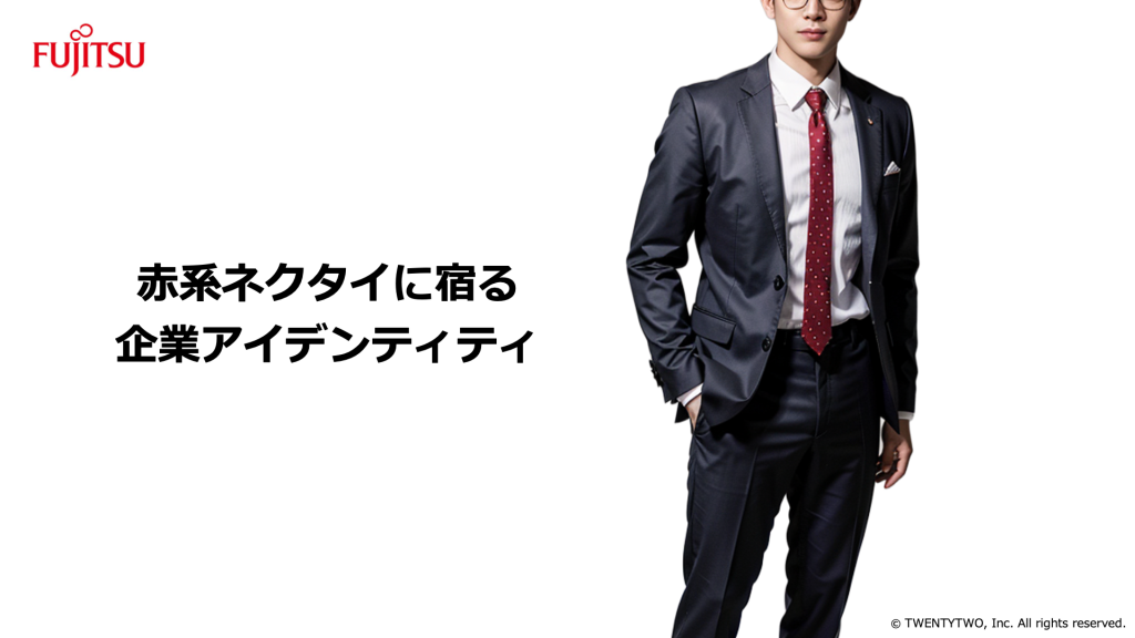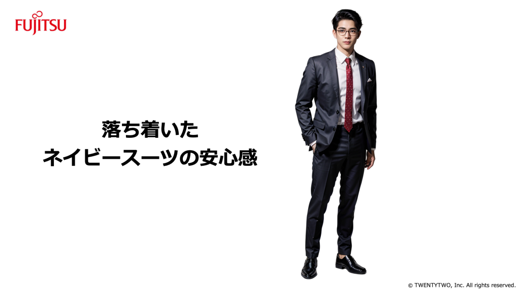 濃紺のスーツは、富士通が長年インフラ・情報通信を支え続けてきた「安定性」と「誠実さ」を象徴しています。派手さより信頼感を優先する企業気質が反映されています。