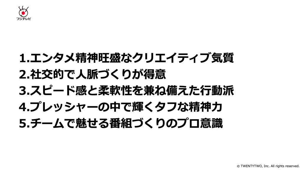 生放送や視聴率競争など、常に高いプレッシャーが伴う環境で働くため、精神的なタフさが必要です。男性社員は、時間や数字に追われながらも冷静に業務を遂行し、最後までやり抜く粘り強さがあります。失敗を恐れず挑戦する姿勢も魅力です。