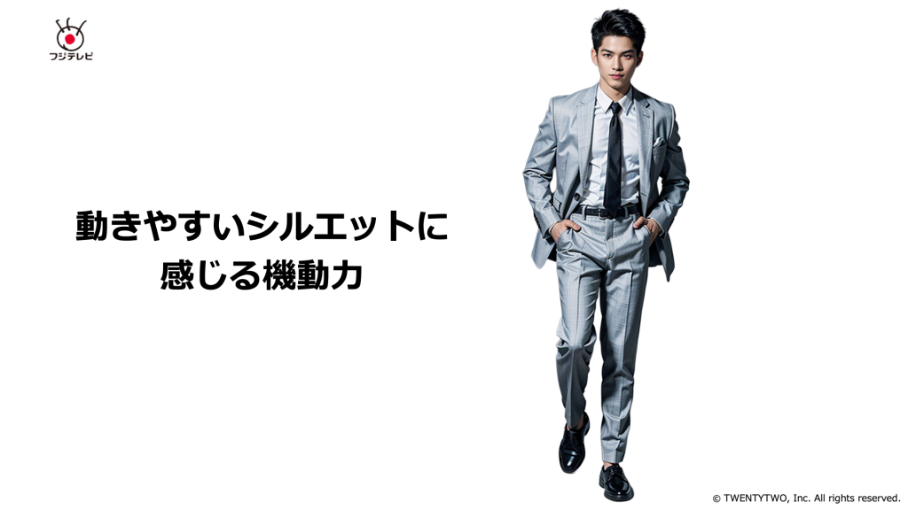 スリムなスーツでも肩回りや袖に若干の余裕があり、取材・会議・スタジオ・ロケなどを行き来する「フットワークの軽さ」を反映しています。華やかさと実務の両面に対応できる装いです。