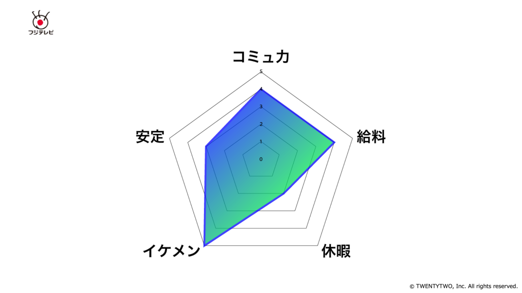 フジテレビの社員は、番組制作やタレント・スポンサーとのやり取りなど、人と関わる場面が非常に多い環境で働いています。明るくフレンドリーな人が多く、空気を読む力や盛り上げる力に長けています。柔軟さと社交性が高いため4の評価です。