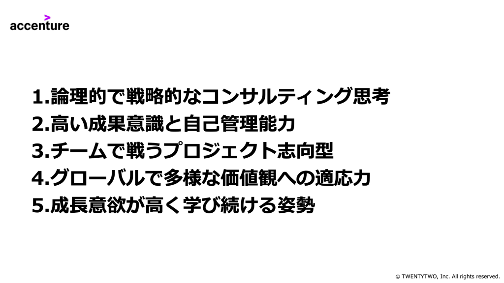 アクセンチュアでは、顧客企業との折衝やチームによるプロジェクト進行が中心のため、論理的に説明する力や相手の意図を読み取る力が求められます。海外メンバーとの協業も多く、柔軟で高いコミュニケーション力を持つ社員が多いため4としています。