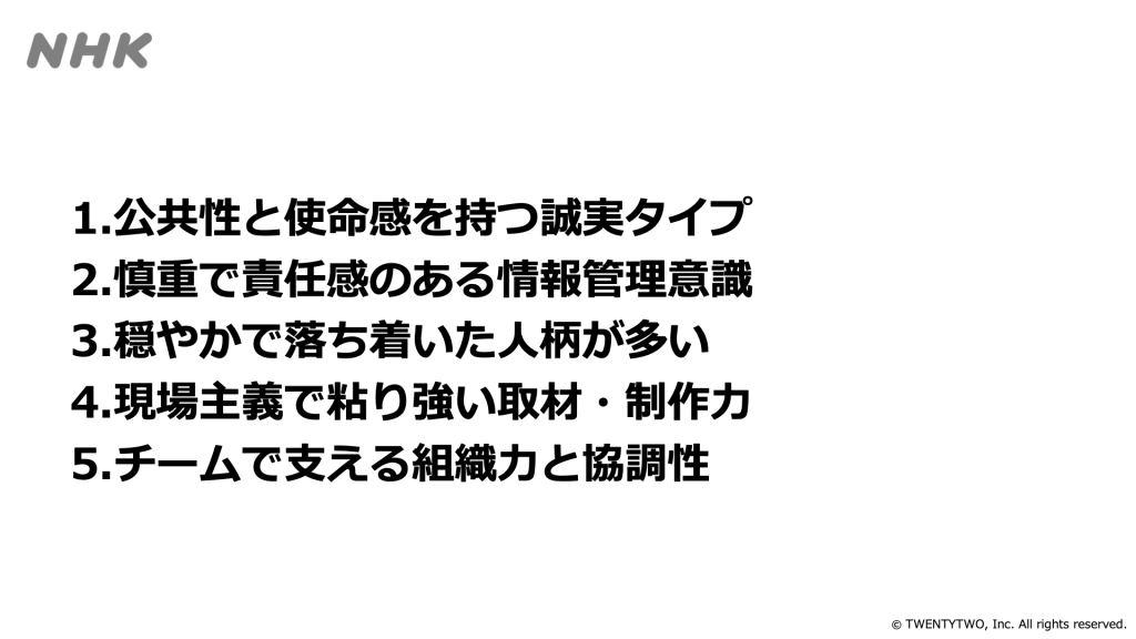 民放テレビ局に比べて派手さはなく、落ち着いた雰囲気の社員が多いです。男性社員も控えめで堅実なタイプが目立ち、視聴者や取材先との丁寧なコミュニケーションを心がけます。真面目さと安定感が信頼につながっています。