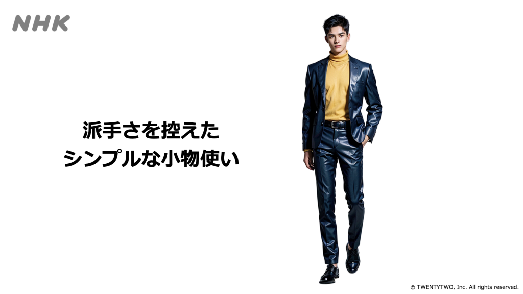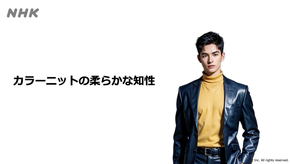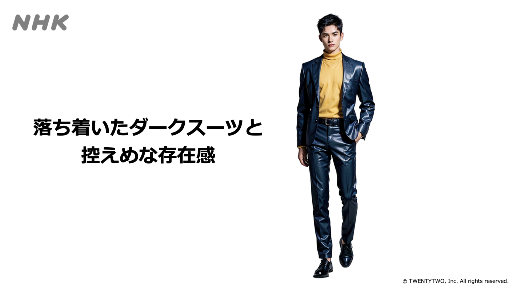 シャツではなく淡いマスタード色のタートルネックを合わせており、堅すぎないが穏やかで知的な雰囲気を演出しています。“伝える側”としての文化性・教養も感じられるポイントです。