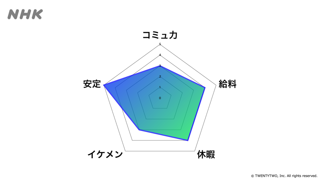 「コミュ力」「給料」「休暇」「イケメン」「安定」の 5つの項目を、それぞれ 5点満点で採点しました。