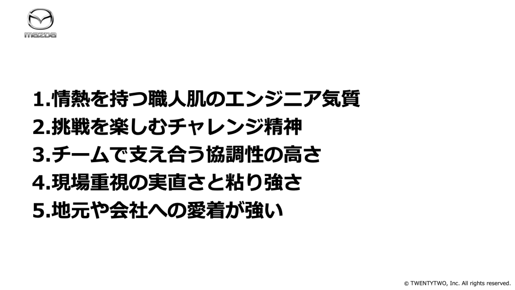 規模が大手他社より小さいからこそ、独自技術(スカイアクティブ技術など)で勝負する文化があります。男性社員も困難な課題にも前向きに取り組み、挑戦そのものを楽しむ気質があります。現状維持よりも“面白い未来”を選ぶタイプです。