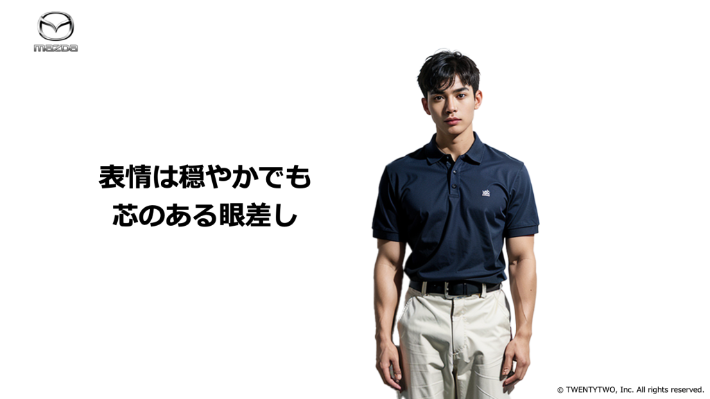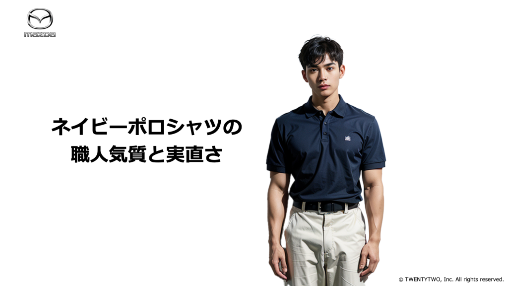 スーツではなく機能的なポロシャツは、マツダの「現場からクルマづくりを支える」「デザインと技術に向き合う職人魂」を象徴しています。華美よりも機能性・誠実さを重視。