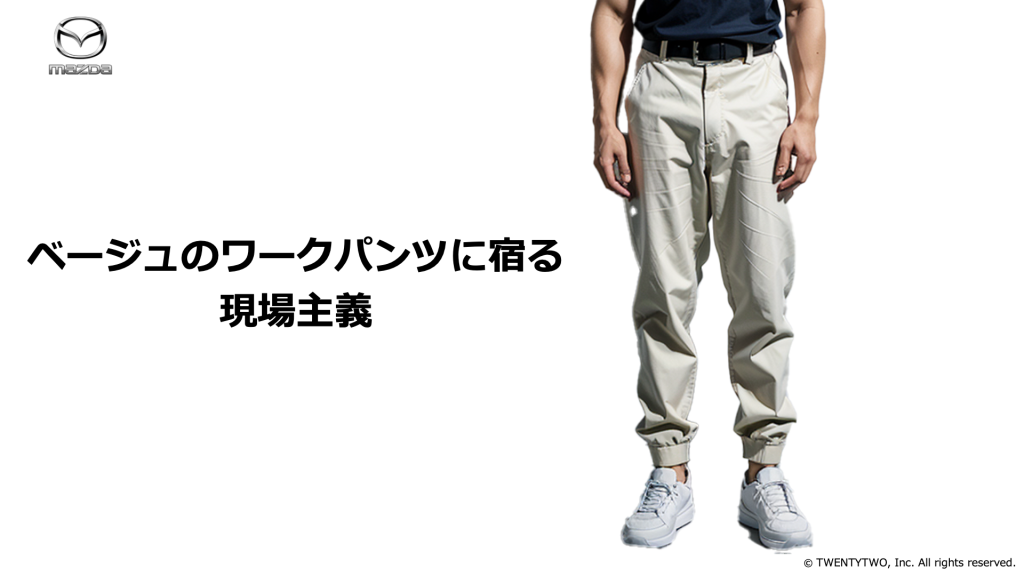 スラックスではなくワークテイストなパンツは、生産現場・開発部門・試験走行など、足を動かしてクルマと向き合う“リアルなモノづくり企業”の姿勢を反映しています。