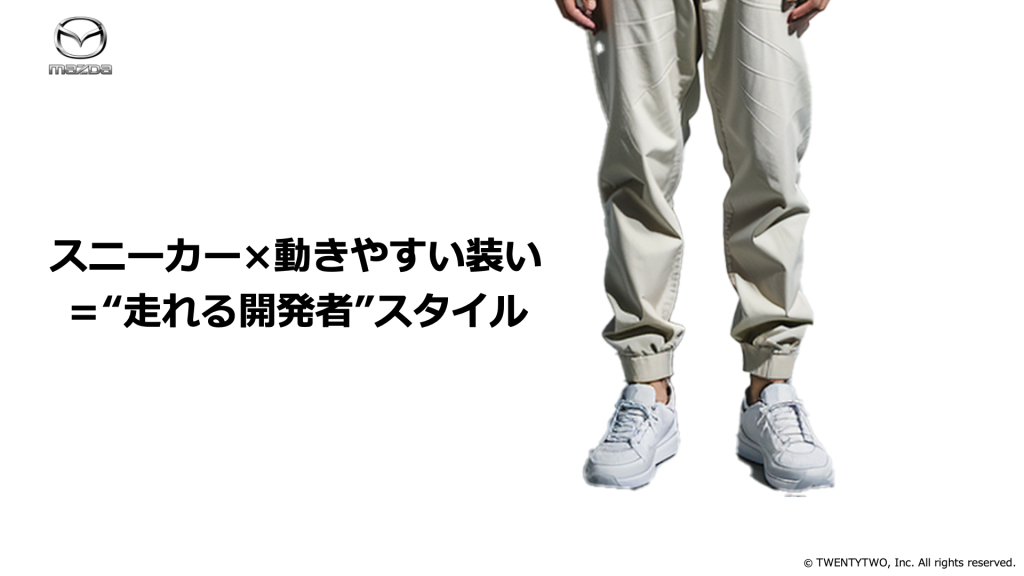 動きやすい白スニーカーは、工場も試験コースも飛び回る姿を想起させます。ブランドだけで着飾らない「機能美と心地よさ」の哲学は、マツダのデザイン思想(魂動デザイン)にも通じます。