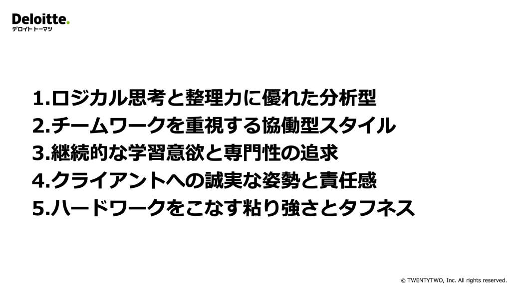 マッキンゼーほど張り詰めておらず、アクセンチュアほど自由でもない。落ち着きと誠実さのある表情は「相手の話を聞く力」「クライアントと伴走する姿勢」を象徴しています。