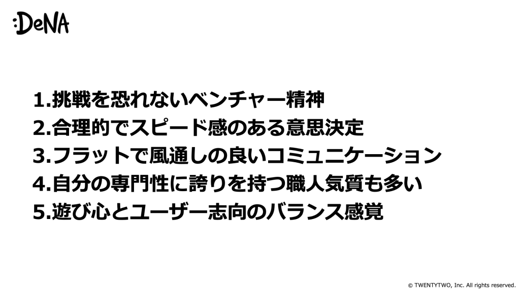 DeNAの男性社員は、失敗を恐れずに新しい事業やアイデアに挑戦する姿勢が強いです。モバイルゲーム、スポーツ、医療、AIなど多様な分野に挑む企業文化の中で、「やってみる」精神が根付いています。変化を楽しむアグレッシブなタイプです。