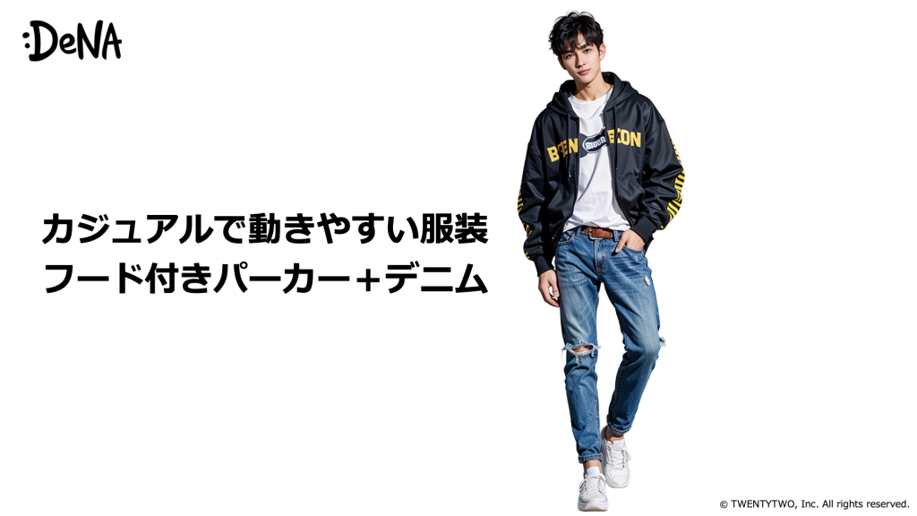 ゲーム・スポーツ・エンタメ事業を手がける企業だけに、胸元のロゴTシャツやアニメ・ストリートブランド系のアイテムを好んで取り入れる傾向があります。