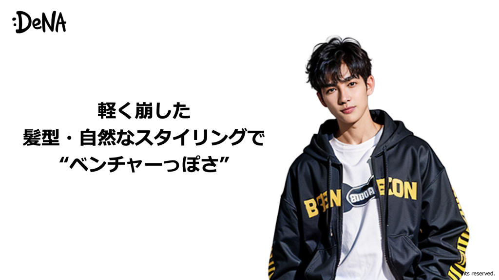 軽く崩した髪型・自然なスタイリングで“ベンチャーっぽさ”