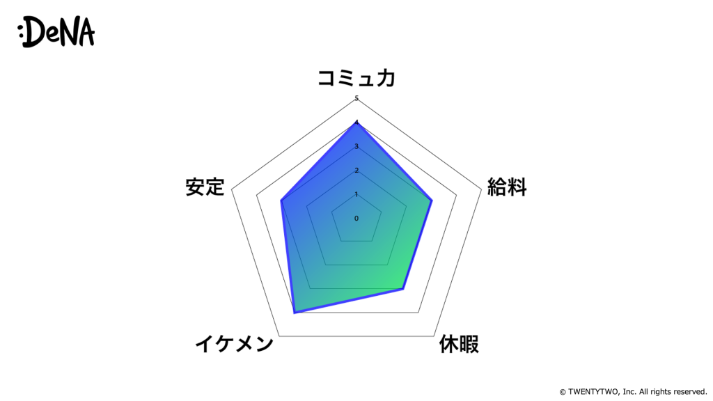 「コミュ力」「給料」「休暇」「イケメン」「安定」の 5つの項目を、それぞれ 5点満点で採点しました。