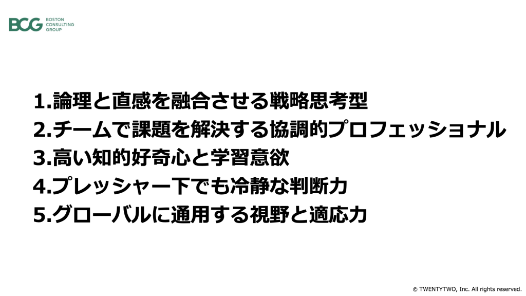 BCGの男性社員は、データやファクトに基づく論理性に加え、直感や創造的な発想も大切にします。定量分析だけでなく、未来を描く構想力も評価されるため、柔軟でバランスの取れた思考力が特徴です。
