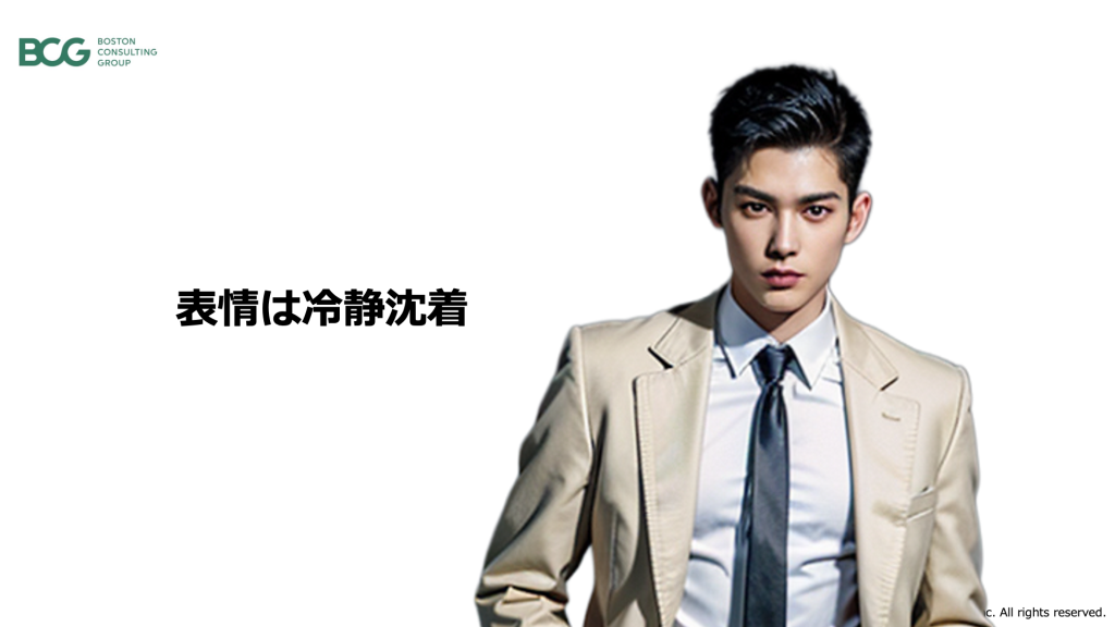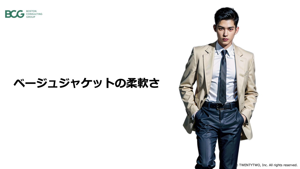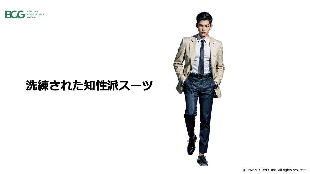 コンサルの中でも柔軟な思考や協調性を重視するBCGらしく、堅すぎないベージュのジャケットで「優秀だけど話しやすい」雰囲気を演出しています。