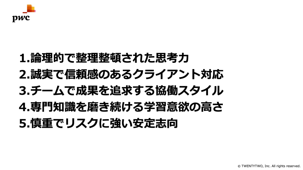 PwCではクライアントとの打ち合わせや社内プロジェクトが多く、論理的で丁寧なコミュニケーションが基本です。一方で、マッキンゼーやアクセンチュアのような強い発信力よりも堅実で控えめな会話スタイルの社員も多く、平均的な評価の3としています。