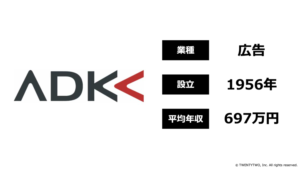 ADKは、広告代理店大手。ADKマーケティングなど3社からなる。2017年にベインキャピタルのTOBにより上場廃止。旭通信社と第一企画が合併して発足。「ドラえもん」や「クレヨンしんちゃん」などのIPコンテンツに強みがあります。