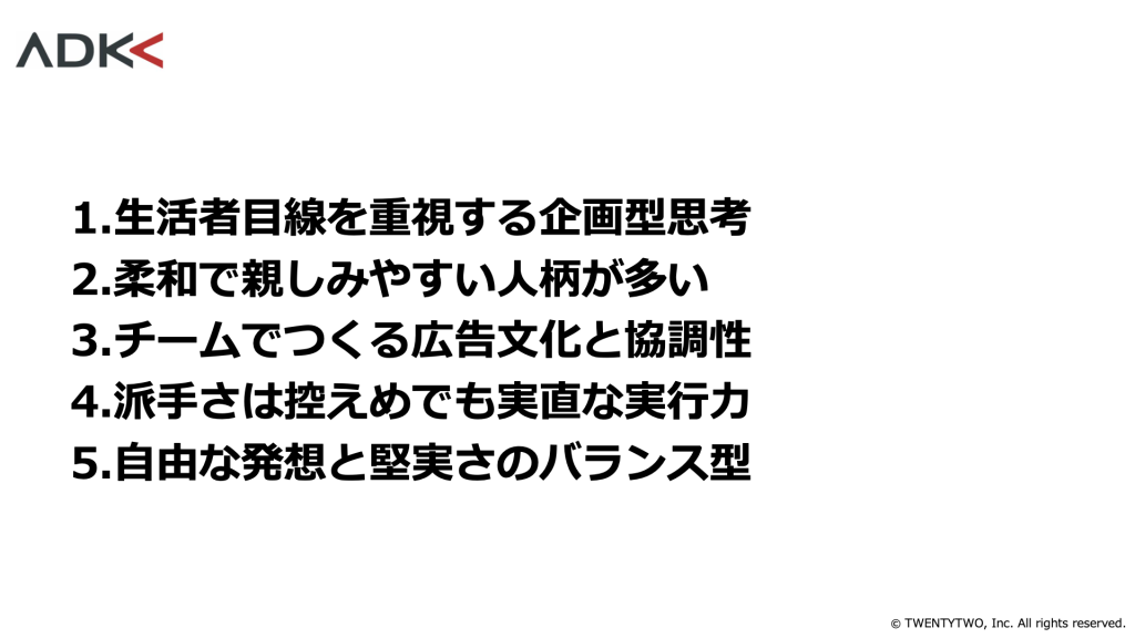 ADKの男性社員は、広告をつくる際に“企業の都合”より“生活者のリアルな感情や行動”を重視します。日常の中にアイデアのヒントを見つけるのが得意で、共感性の高い企画を生み出す柔らかな発想力が特徴です。