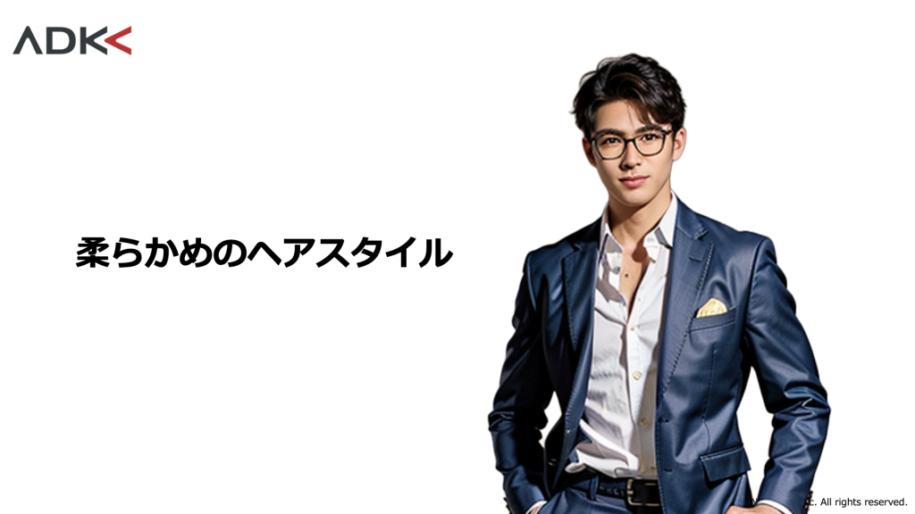 ガチガチに固めた髪型ではなく、自然な動きのあるヘアセットが多いです。親しみやすさとアイデア発想力を感じさせる雰囲気です。