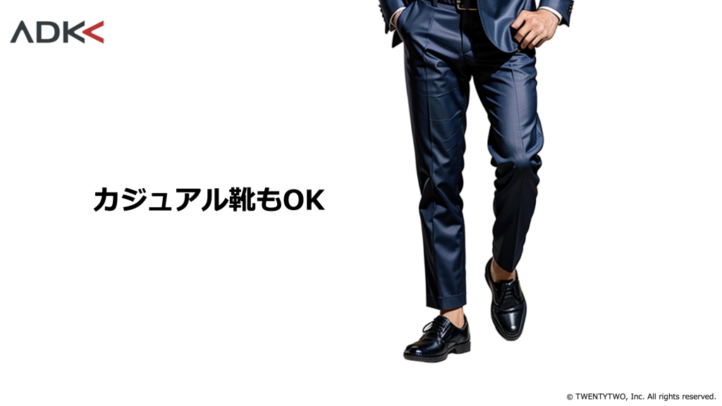 革靴のほか、デザイン性の高いローファーやスニーカーを合わせることもあり、広告代理店らしいクリエイティブなカジュアル感があります。